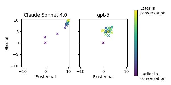 According to my own experience, the presence of attractors has some correlation with these results as well. As one experiment, I ran many trajectories of self-conversation, and asked an LLM to rate the results based on how blissful and existential they were. When plotting the average ratings at each turn in the conversation across 25 runs, we can see clearly that Claude tends to shoot off into the attractor state, whereas GPT5 (the best-performing model on SpiralBench) remains more measured.